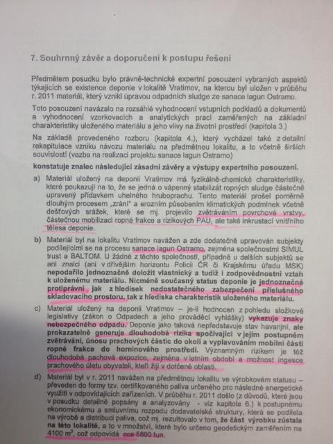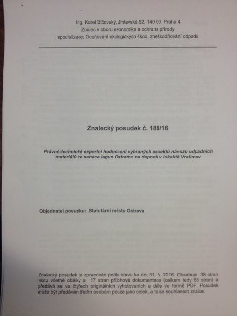 Znalecký posudek č. 189/16, který si nechalo vypracovat Statutární město Ostrava, vyhodnotil deponii ve Vratimově (ony haldy směsí mj. odpadu z ostravských lagun) takto: